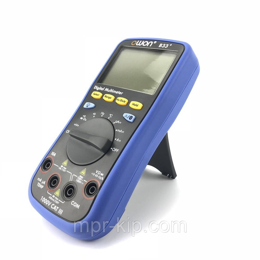 B33+ мультиметр цифровий, виробництва компанії OWON. Професійний цифровий мультиметр B33+ призначений для вимірювання AC/DC напруги, AC/DC струму, опору, ємності, температури, частоти, а також тестування діодів і перевірки ланцюга на провідність. Модель B33+ оснащена модулем Bluetooth для передачі результатів вимірювань на мобільні пристрої Android і iOS 4.3 7.0. За допомогою встановленого можна реалізувати як збір і зберігання результатів вимірювання у тому числі і у форматі csv, так і побудова графіків і діаграм, їх порівняння та аналіз. Програмне забезпечення дозволяє працювати з декількома мультиметрами одночасно.